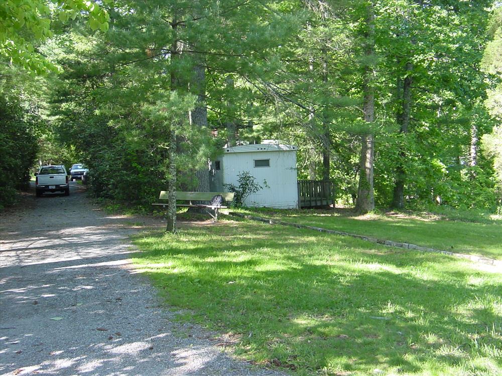 The trailer restroom is located a couple hundred feet west of the main house ("Connemara") at about 35° 16' 17"N, 82° 26' 54"W.
