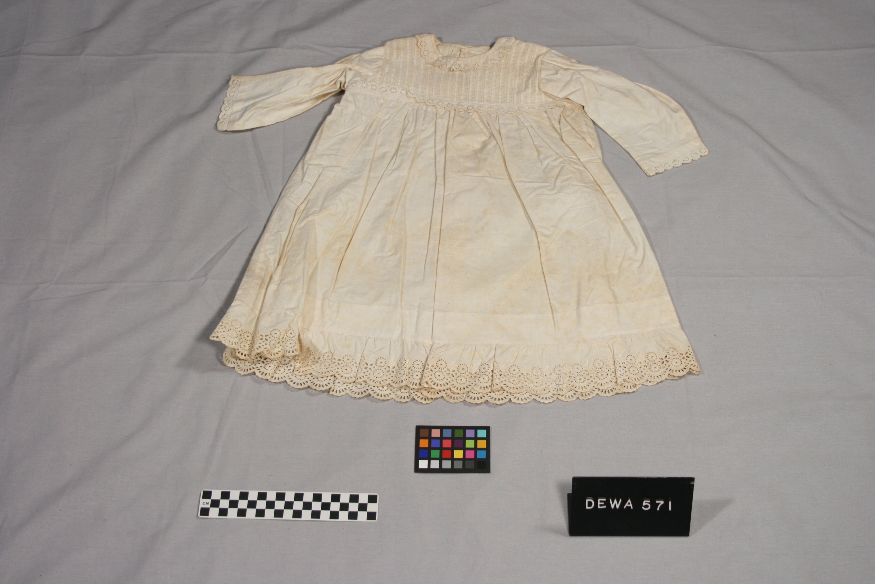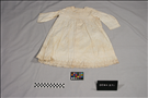 Childs white dress, embroidered lace edging, back closing with nine buttons
