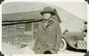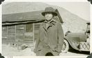 This is an historic black and white photograph from the Scotty's Castle Historic Photograph Collection, Death Valley National Park of a woman posing for the camera in front of a simple wood structure and passenger car. Woman in rolled-brimmed hat, shirt, and heavy coat. A few crates and rocks stacked next to building foundation. Desert hillside in background. Number in black ink in lower left corner.