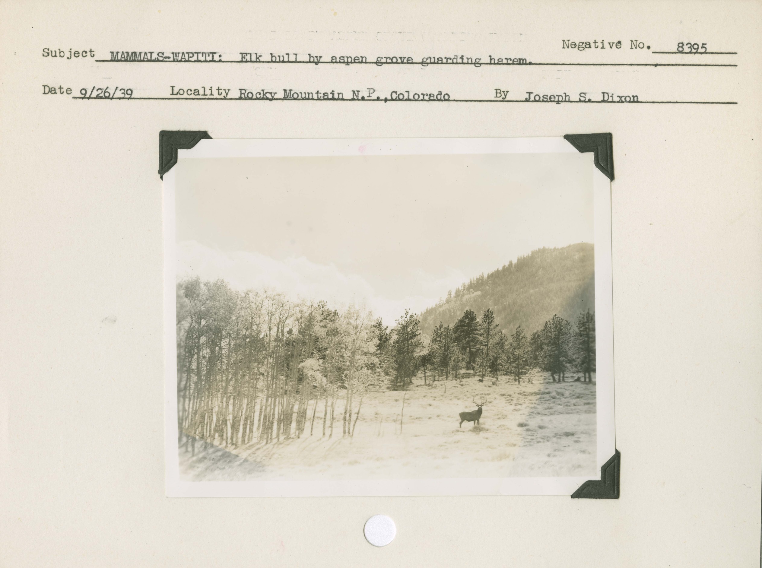 Mammals -- Wapiti [Elk]: Elk bull by aspen grove guarding harem. Negative #: 8395. Locality: Rocky Mountain National Park, Colorado.