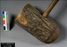USED TO BANG COPPER SHEETS INTO PLACE FROM SCAFFOLDING. HEAD DOES NOT HAVE META<CRL BANDS, INDICATING THAT TI WOULD BE USED FOR AN ARTISTIC MEDIUM SUCH AS REPOUSSE SCULPTUR<CRE. (METAL BANDS WOULD SCRATCH THE SHEET METAL.) HEAD IS MADE OUT OF A TREE SECTION, ROUND<CRED AT BACK AND FLAT OF FACE. HANDLE HAS SEVERAL CRACKS.<CR<CRLYNCH IN ORAL HISTORY FILES.