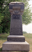 1 of 110 Mn to Pennsylvania. Sited by Coster's Brigade wall, indicates position taken by 27th PA night of july 1, 1863 until moved to Cemetery July 3. LF&RF markers 41' & 42" E-W of mn, respectively.