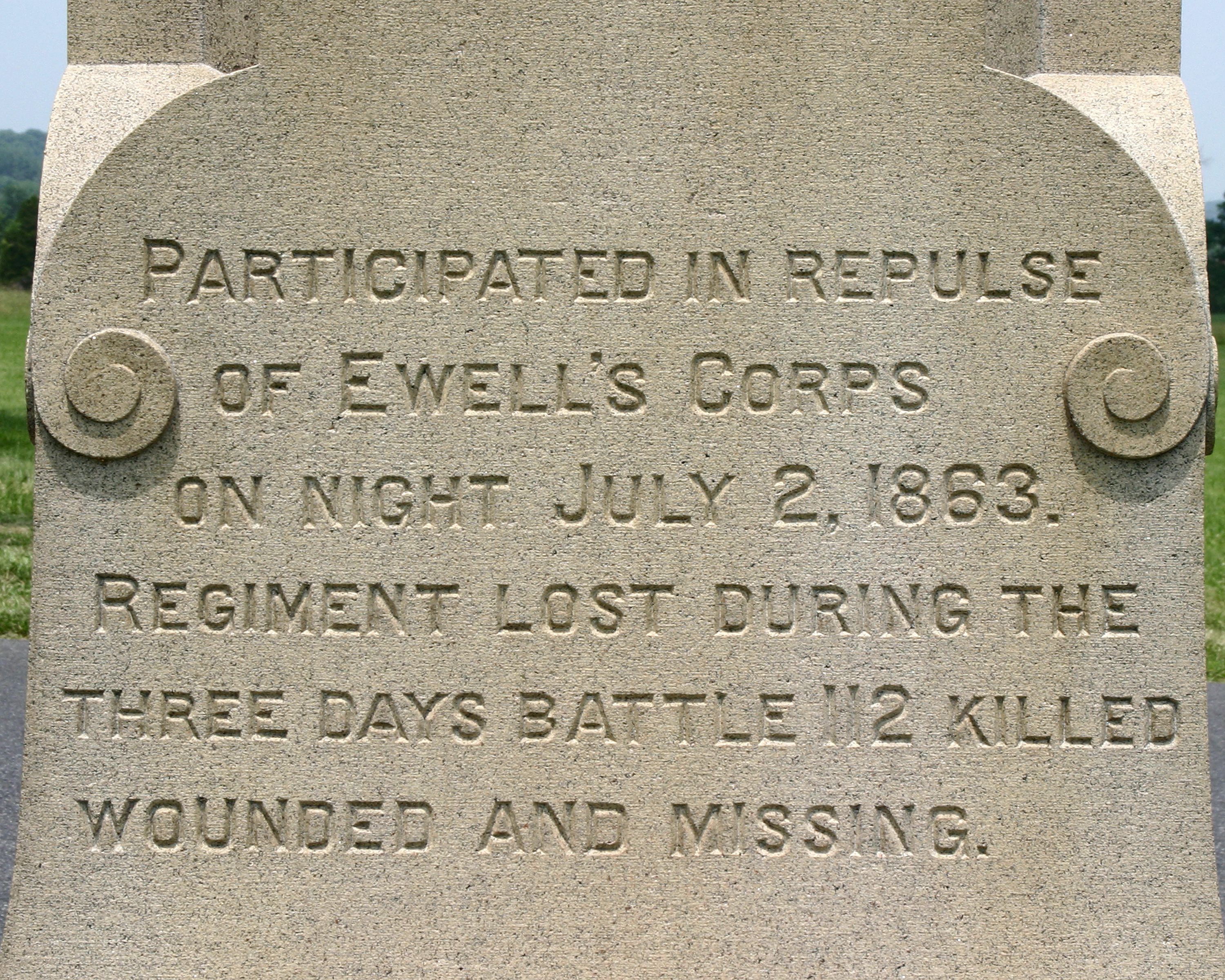1 of 4 Monuments to Illinois. Marks 1st line of battle held by 82nd Illinois before retreating to East Cemetery Hill. Located on W Howard Ave near Wheeler's Battery. || 1 Mn. Smooth base 5' sq. Smooth shaft with excised inscription & detailing, bronze medallion in lower part of shaft. Topped w/curved, cylindrical cap. All 12'6" H. Small chips in base.