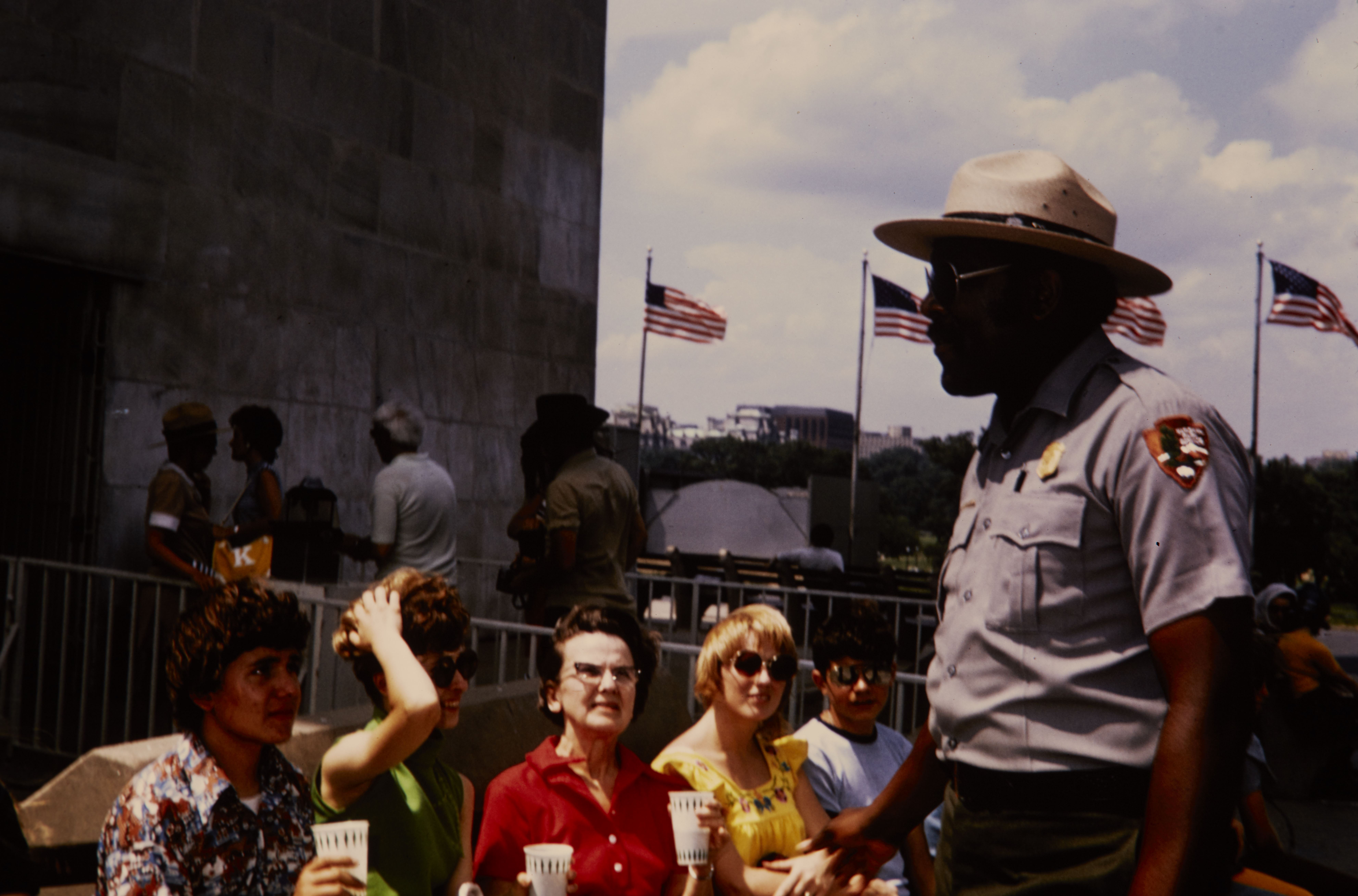 NPS Employee talking to visitors outside of the Washington Monument. Image Number 73-304-16.