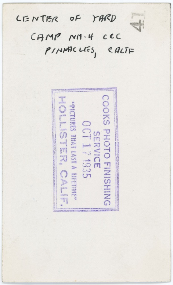 Original ID Portrait of a western camp. 1954th Company, CCC, Camp NM-4. Pinnacles National Monument. Pinnacles, California. Quadrangle. [Reverse side of image] Center of yard, Camp NM-4 CCC, Pinnacles, Calif., 4.25 x 2.5 inches