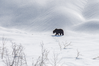 Brown bear walking on smooth snow with sparse vegetation poking through.