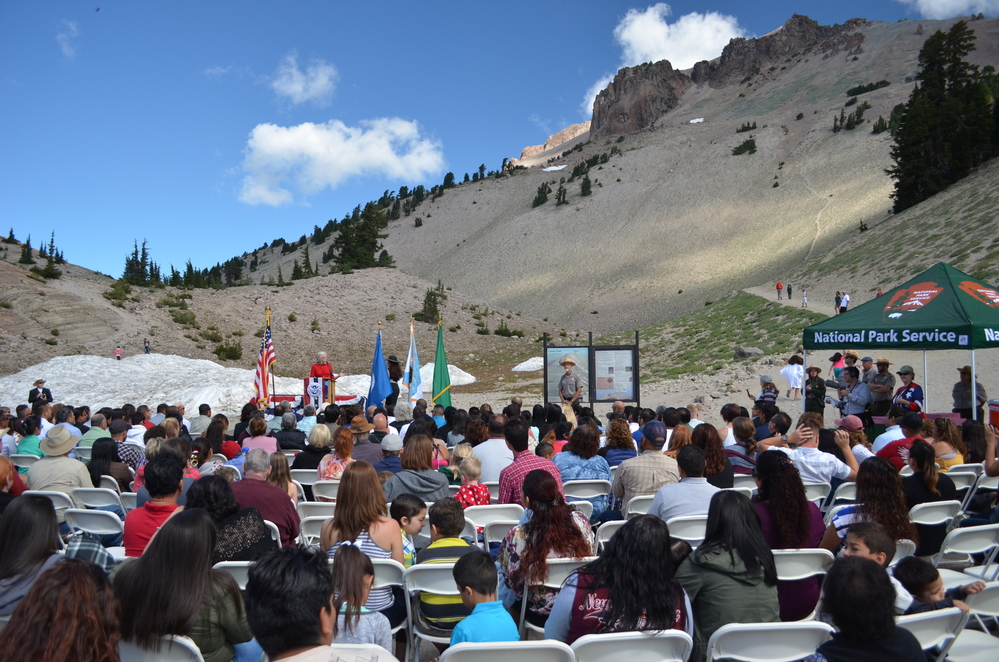 Attendees listen to a speaker at the centennial naturalization ceremony at the Lassen Peak parking area.