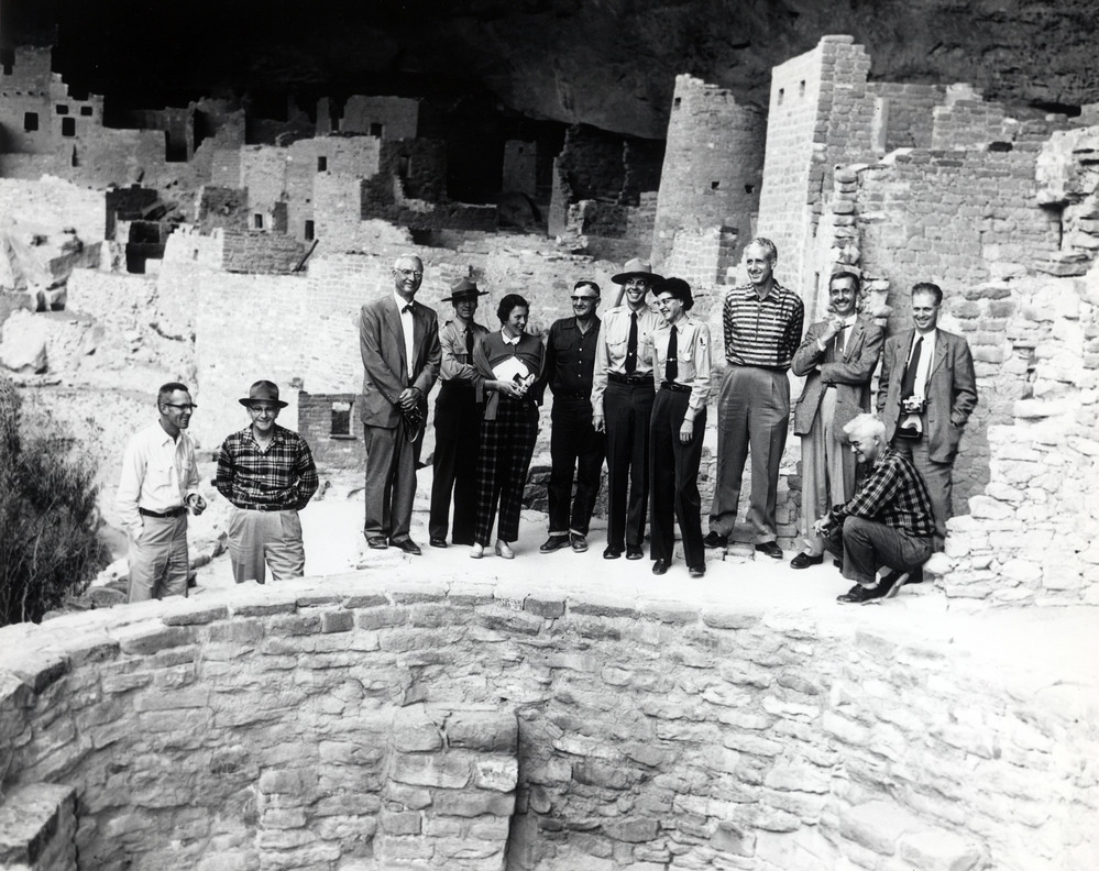 Jean Pinkley, an archaeologist at Mesa Verde National Park, with officials of the National Geographic Society, Smithsonian Institute, and the National Park Service in the Cliff Palace, the largest of the cliff dwellings.