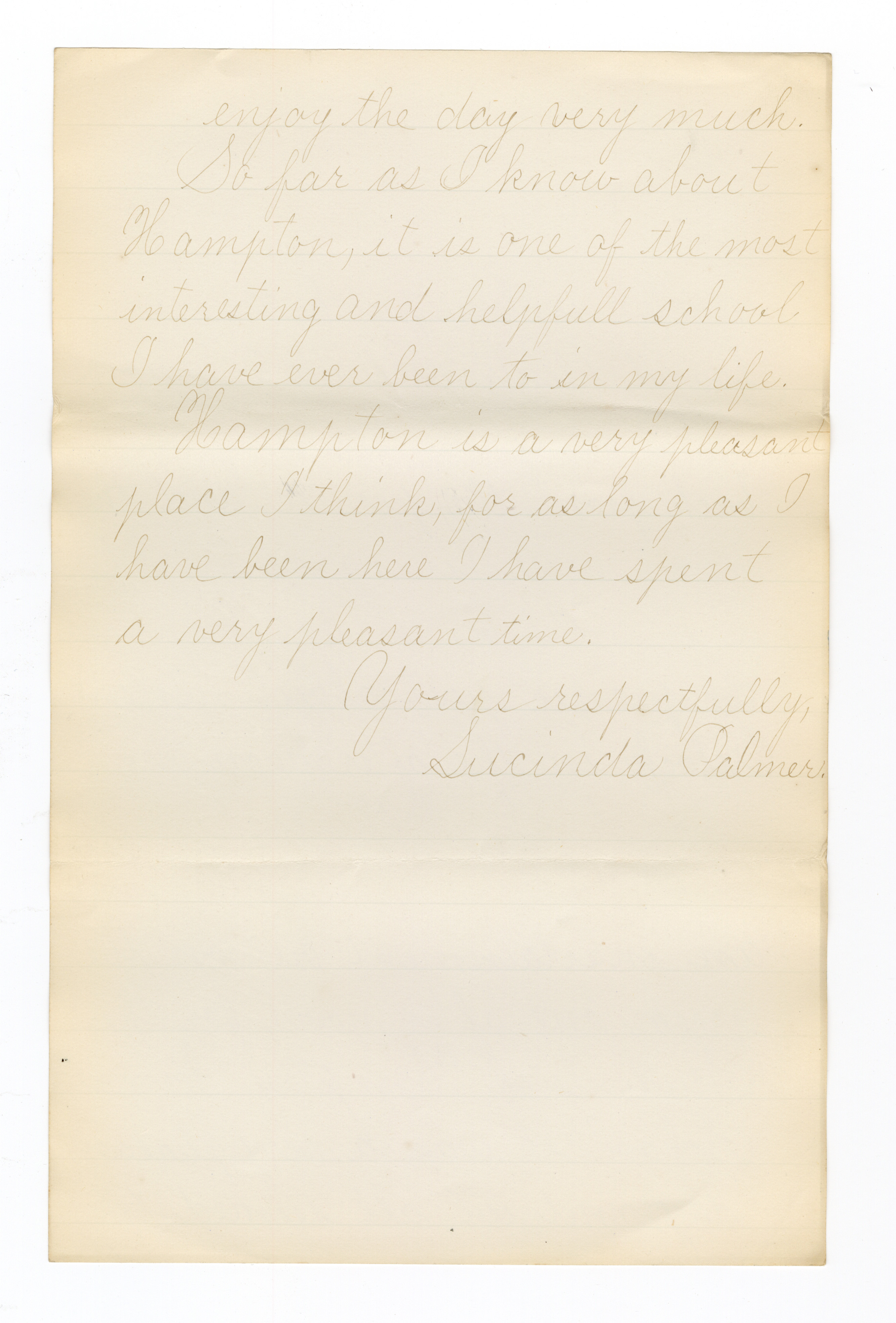 And I hope to remain in Hampton Normal School until I finish my Education, since I have been to Hampton I have found it to be a very pleasent [sic] and beautiful place.