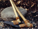 Two Hawaiian stone adzes, or koʻi, with long wood handles sit on a large flat pōhaku (rock).