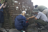 Masonry repairs to Cockspur Island Lighthouse, 2015-16. Fort Pulaski preservationists routinely inspect and repair damage to the lighthouse. Pictured, staff members work with preservation students to repair masonry on the lighthouse steps. This strengthens the foundation of the lighthouse so it can survive for many more years to come.