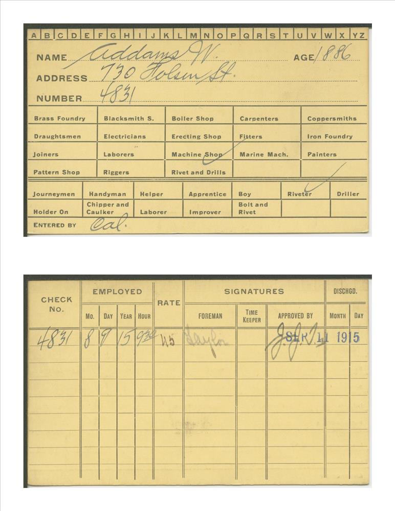 Early twentieth century employee card containing identifying information on the employee, and salary history, from Union Iron Works Co., which had been acquired by Bethlehem Steel Corporation.
