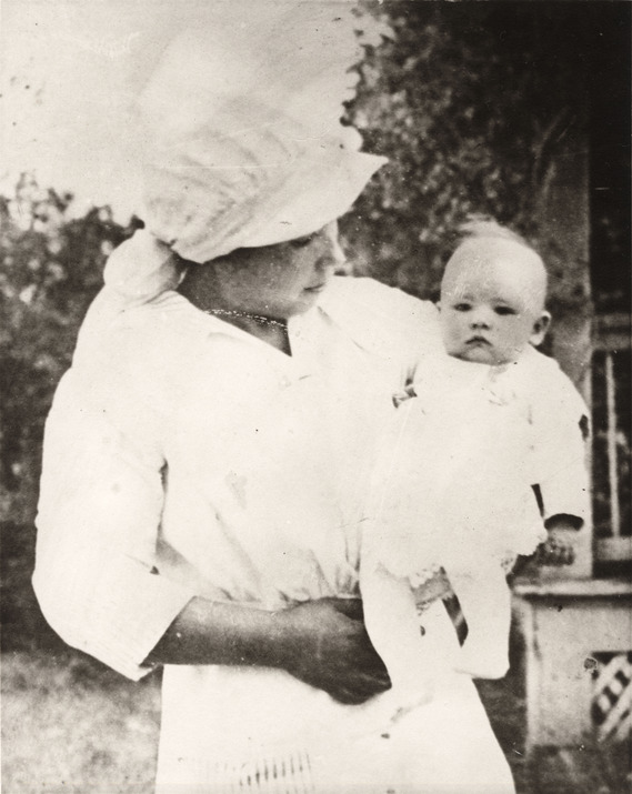 Black and white photograph of a woman holding a baby