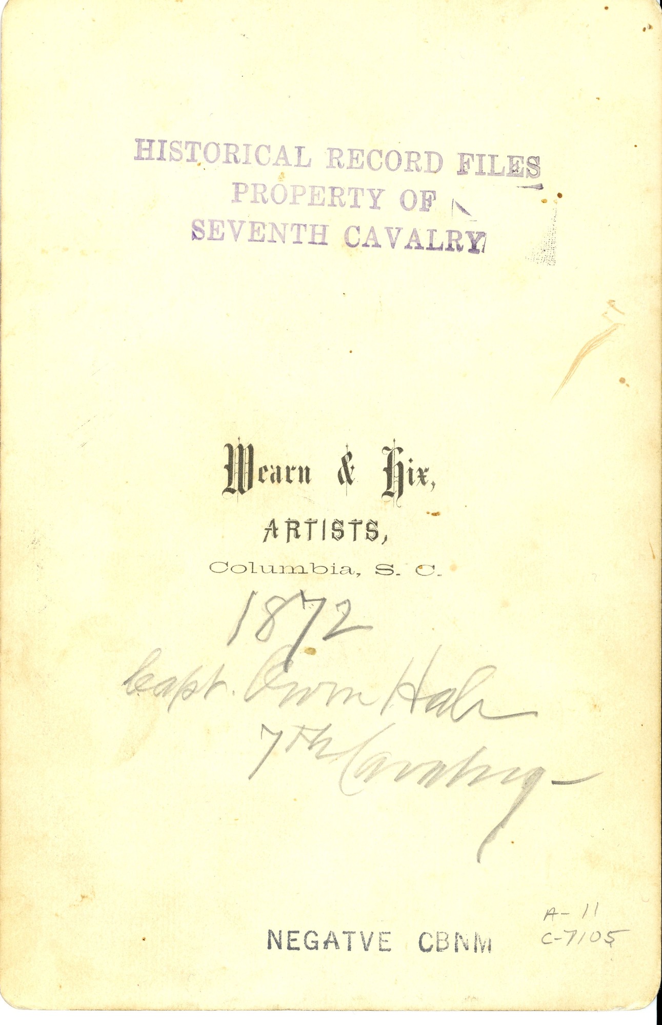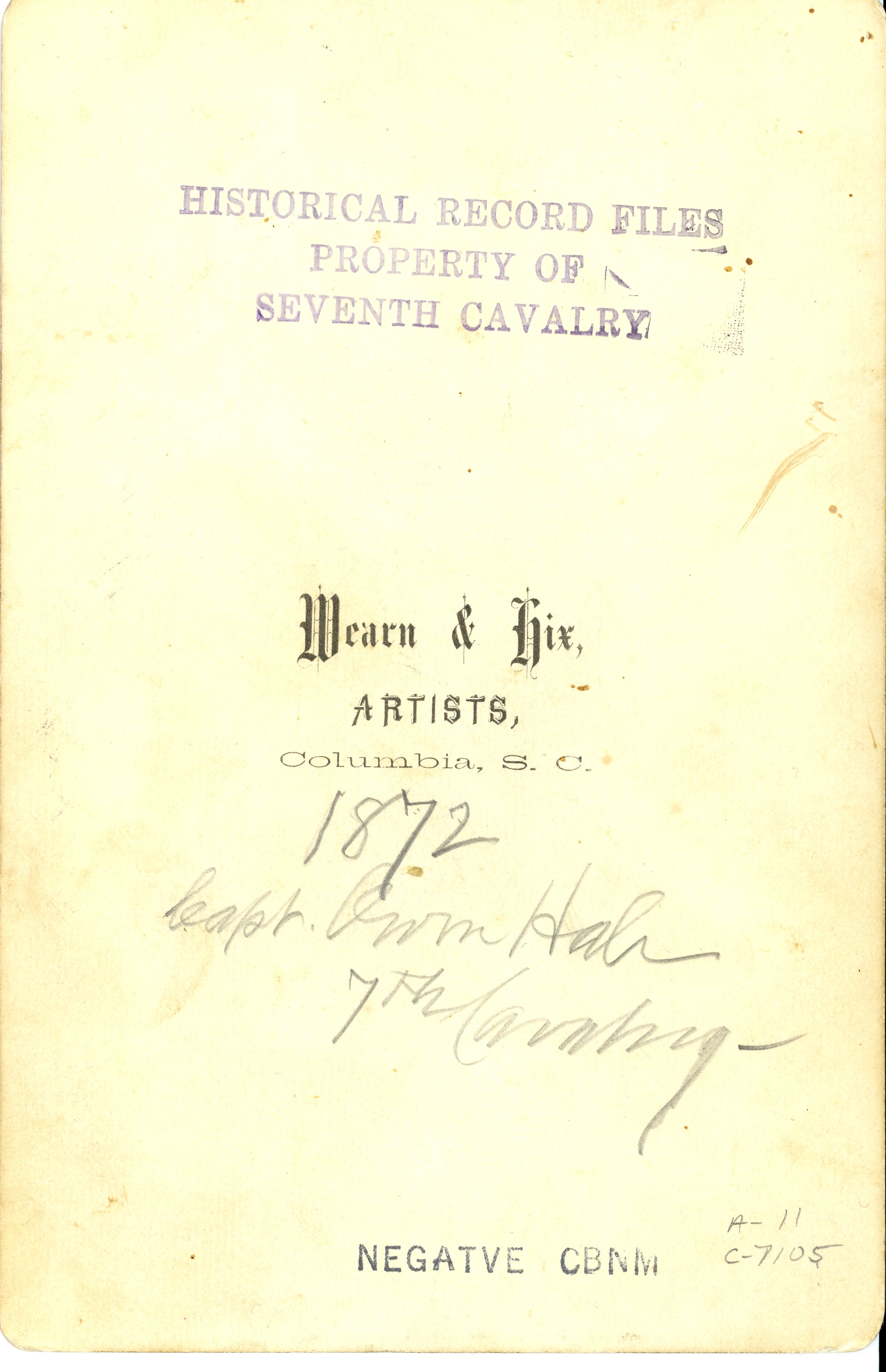 LIBI_00011_07105; An albumen cabinet card (mounted photograph) of Capt. Owen Hale, 7th U. S. Cavalry in 1872; name of photographer studio is on the verso: Wearn and Hix, artists, Columbia, South Carolina. Capt. Hale was on detached service at the time of the Little Bighorn. Hale was killed while fighting the Nez Perce on Sept. 30, 1877.; CARD, CABINET [Card photograph]; Courtesy of the National Park Service, Little Bighorn Battlefield National Monument, LIBI_00011_07105, Richard Wearn and William P. Hix, "Captain Owen Hale, 7th Cavalry," 1872