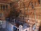 Dozens of various metal tools hang inside on wooden walls above a cluttered wooden workbench.