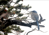 Like many other corvids, the scrub jay relies on highly accurate and complex memories to recover the hidden caches of food they store within their territories. During this collection and storing process, they have shown an ability to plan ahead in choosing cache sites to provide adequate food storage volume and variety for the future. They even implement strategies to reduce theft of their own food stores. These mischievous birds are not above outright theft of other bird's stores, though. You might also see a scrub jay standing on the back of a mule deer. it is picking off and eating parasites from the deer. Often, the deer will stand still and hold up its ears to give jays access to their parasites!