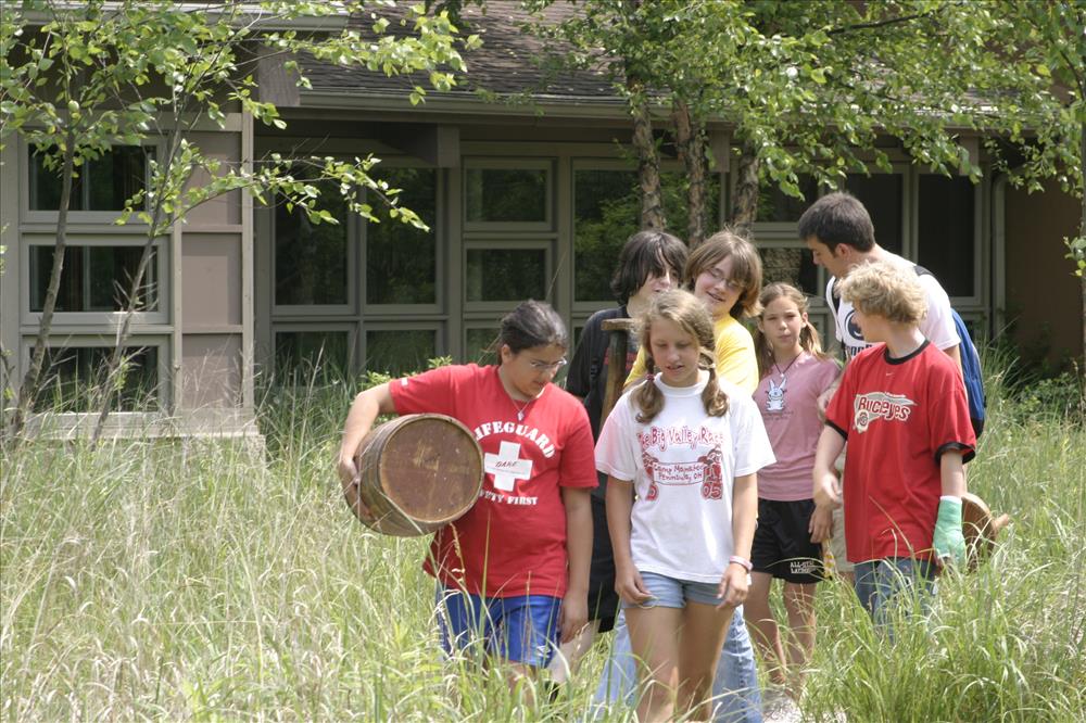 Since the mid-1990s, Cuyahoga Valley Environmental Education Center has offered a variety of summer residential camps. River Run - Theatre: "Fantasy in the Forest" is provided in partnership with Magical Theatre Company. Children entering grades 5-10 work with professional faculty to develop their performing arts skills in acting, voice, movement, and stage combat. The short performances are outdoors and integrate into the natural setting of the CVEEC campus. || Campers walk outside November Lodge, the main activities building at CVEEC.