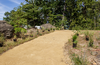 A light brown gravel trail leads up a hill and disappears. Small black containers of grass line both sides of the trail. Tall green leaf trees stand at the summit of the hill.