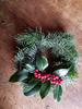 The wire wreath frame with evergreen boughs attached and a sprig of holly with red berries.