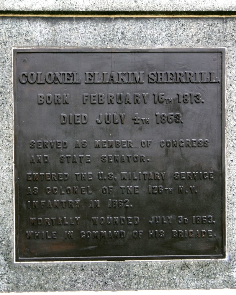 1 of 90 Monuments to New York. Indicates 126th NY Infty position Jul 3. LF&RF mkrs 66'&75,' respectively, N-S from Mn. Mn located E side Hancock Ave in Ziegler Grove. || Mn & 2 flank markers. Mn: 8'5"x7'5" base, 16'4"H. Stepped base to polished & finished stepped stone shaft, pryamidal cap w/ trefoil finial. Excised inscription, bronze bas-relief, medallion, & tablets. RF&LF markers: 1'sq x 1'10"H