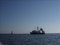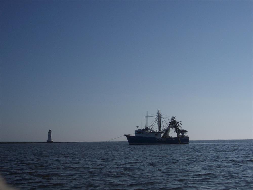 view of Cockspur Island Lighthouse and a shrimp boat from across the south channel of the Savannah River, facing north from the entrance to Lazaretto Creek
