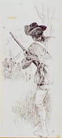 Young Virginia militiaman behind a tree as oncoming ranks of British Highlanders and/or Jagers advance in order from woods.