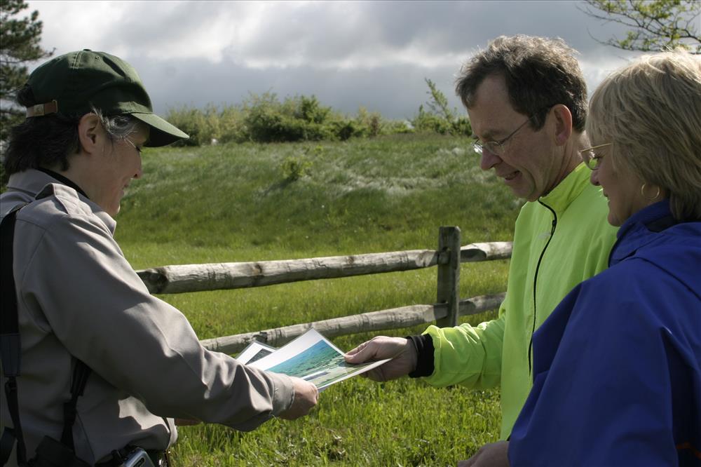 Cuyahoga Valley National Park is designated an Important Bird Area by the Audubon Society of Ohio, in part because of the restored grasslands at the site of the former Richfield Coliseum. A property once known for its sports/concert arena is now managed by the National Park Service as a grassland for rare birds. Cuyahoga Valley National Park offers year-round programs on bird watching. || Visitors talk with Lisa Petit, Chief of Resource Management; former Richfield mayor Ralph Waszak, Sr.; and another volunteer at an interpretive program called After the Coliseum in 2006. The program was an opportunity for local residents to learn how the park intends to manage this newly restored property. .