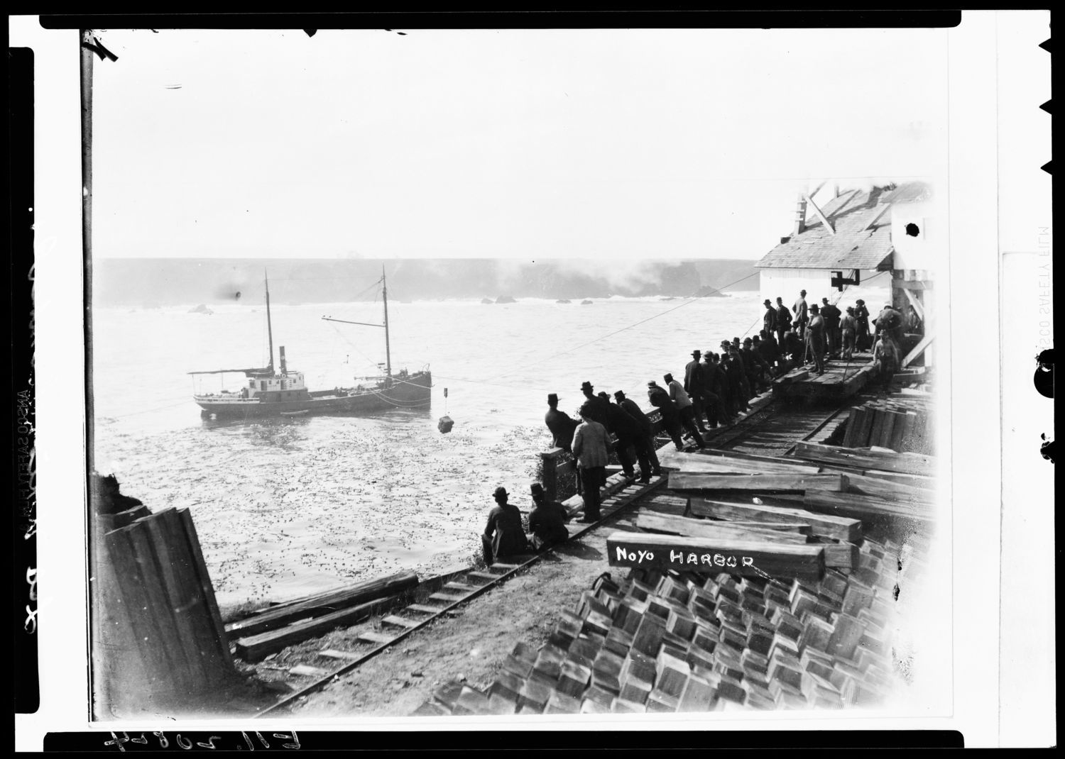 Sightseers watching the loading of a freighter by a wire chute, at Noyo, CA, undated
