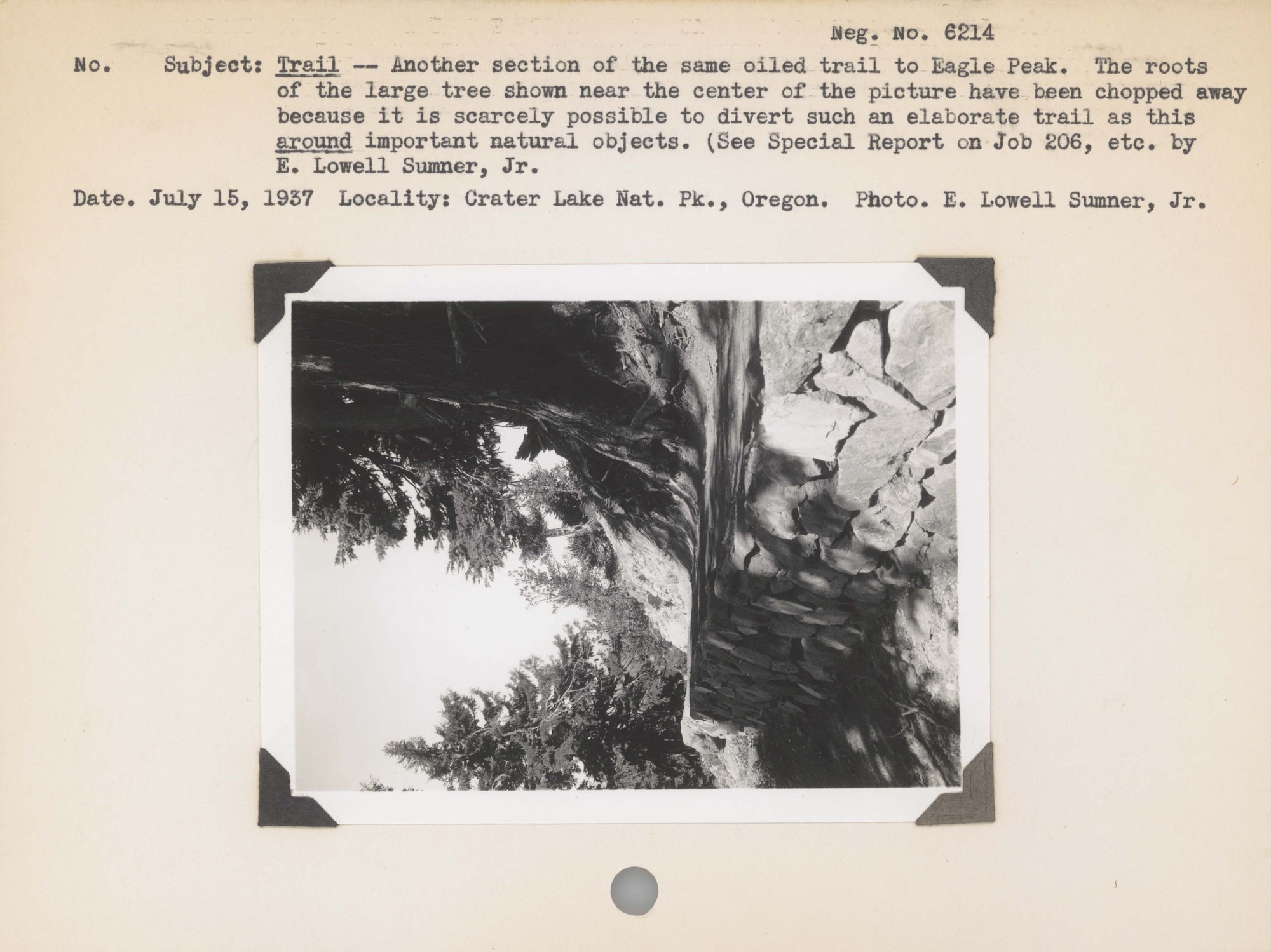 Trails – Another section of the same oiled trail to Eagle Peak. The roots of the large tree show near the center of the picture have been chopped away because it is scarcely possible to divert such an elaborate trail as this around important natural objects. (See “Special Report on Job #206,” etc. by E. Sumner, Jr.). Negative #: 6214. Locality: Crater Lake National Park, Oregon.
