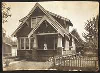 A Craftsman-style house with a woman standing on the front porch. There is a fenced yard next to the house.