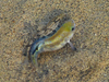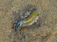 A small yellow fish swims next to a tan and black fish that blends in with the sand at the bottom of a stream.