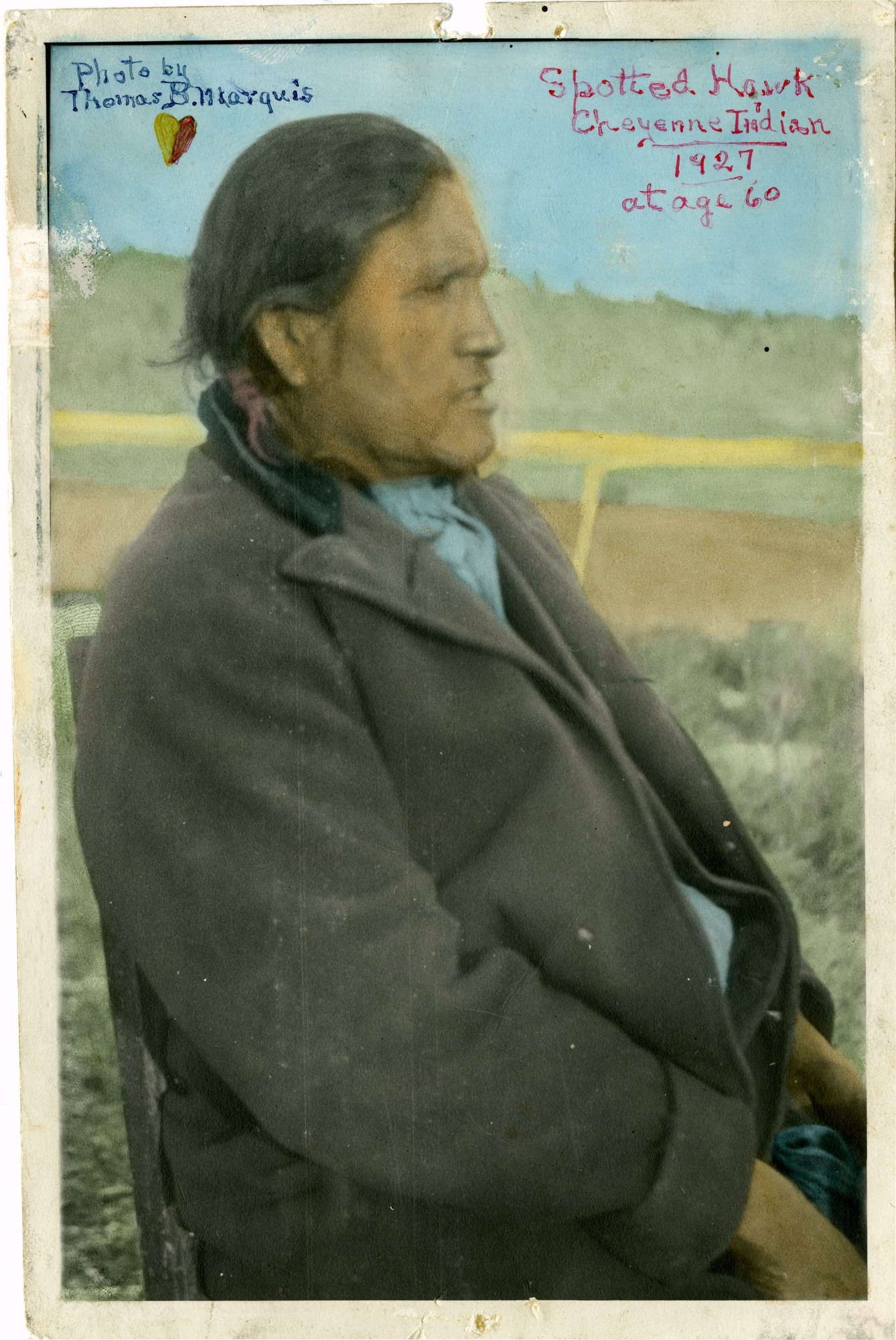LIBI_00012_01956; A hand-tinted photograph of Spotted Hawk (Cheyenne), seated view; produced by Thomas Marquis, circa 1927; originally mounted on cardboard.; print, photographic; Courtesy of the National Park Service, Little Bighorn Battlefield National Monument, LIBI_00012_01956, Thomas B. Marquis, "Spotted Hawk, Aged 60, Seated in Profile Facing Left," circa 1927