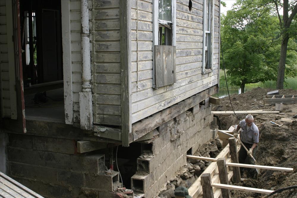Maintenance employees work on the foundation of the Martin House, one project in CVNP's Historic Structures Rehabilitation Program. || From 2006-2007 the Martin House was rehabilitated as part of CVNP's Historic Structures Program. This property will likely be leased as a Countryside Initiative farm. CVNP enters into agreements with sustainable farmers in order to preserve the rural heritage of the Cuyahoga Valley.