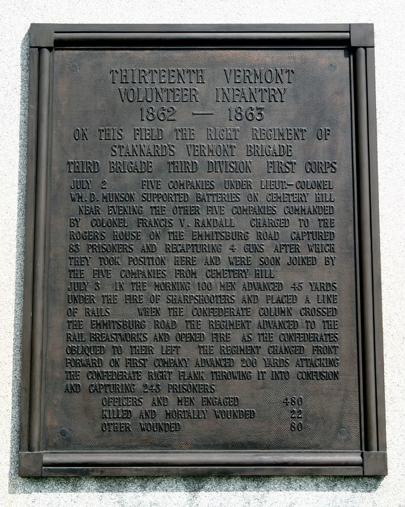 1 of 6 Vermont monumnets. Indicates regiment position July 2, 1863. 3 Position Markers show regiment location July 3, 1863. Aided in repulse of Longstreet's assualt. Located E side Hancock, Pos Mkrs as follows: E of Mn, NW of Mn, N of US Reg Mn. || Mn w/ 3 Position Markers. Base 8'sq. Stepped shaft, excised inscription, bronze tablets & medallion on shaft. Topped w/ bronze statue of Lt. Stephen F. Brown. All 16'4"H. Position Markers 1'6"x1'8"x3'8"H w/ incised inscription.