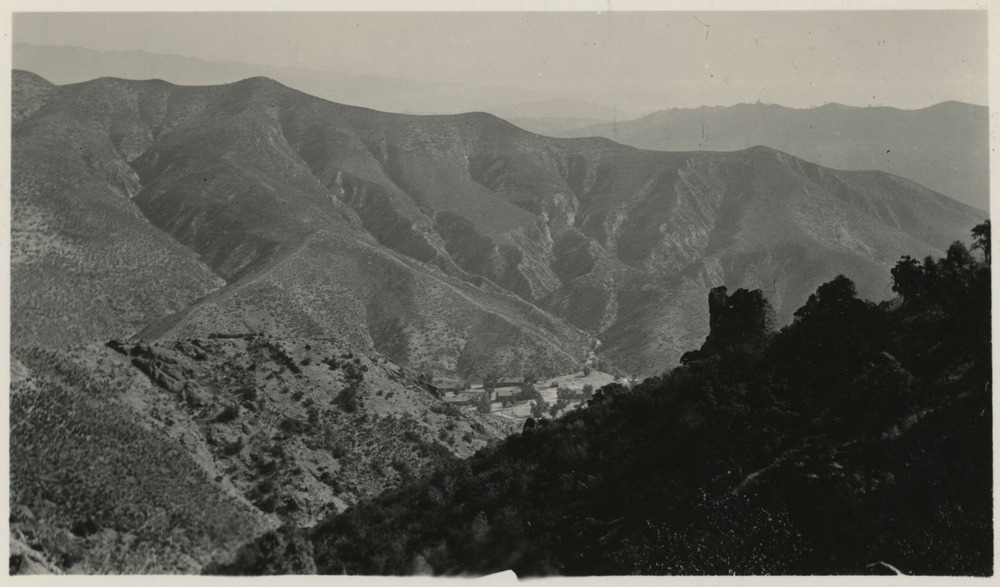 Original ID Portrait of a western camp. 1954th Company, CCC, Camp NM-4. Pinnacles National Monument. Pinnacles, California. [Continued from PINN-4372-0886 original description] The smaller it is. [Reverse side of image] CCC Camp, Pinnacles, from CCC Trail, 10/35., 4.25 x 2.5 inches