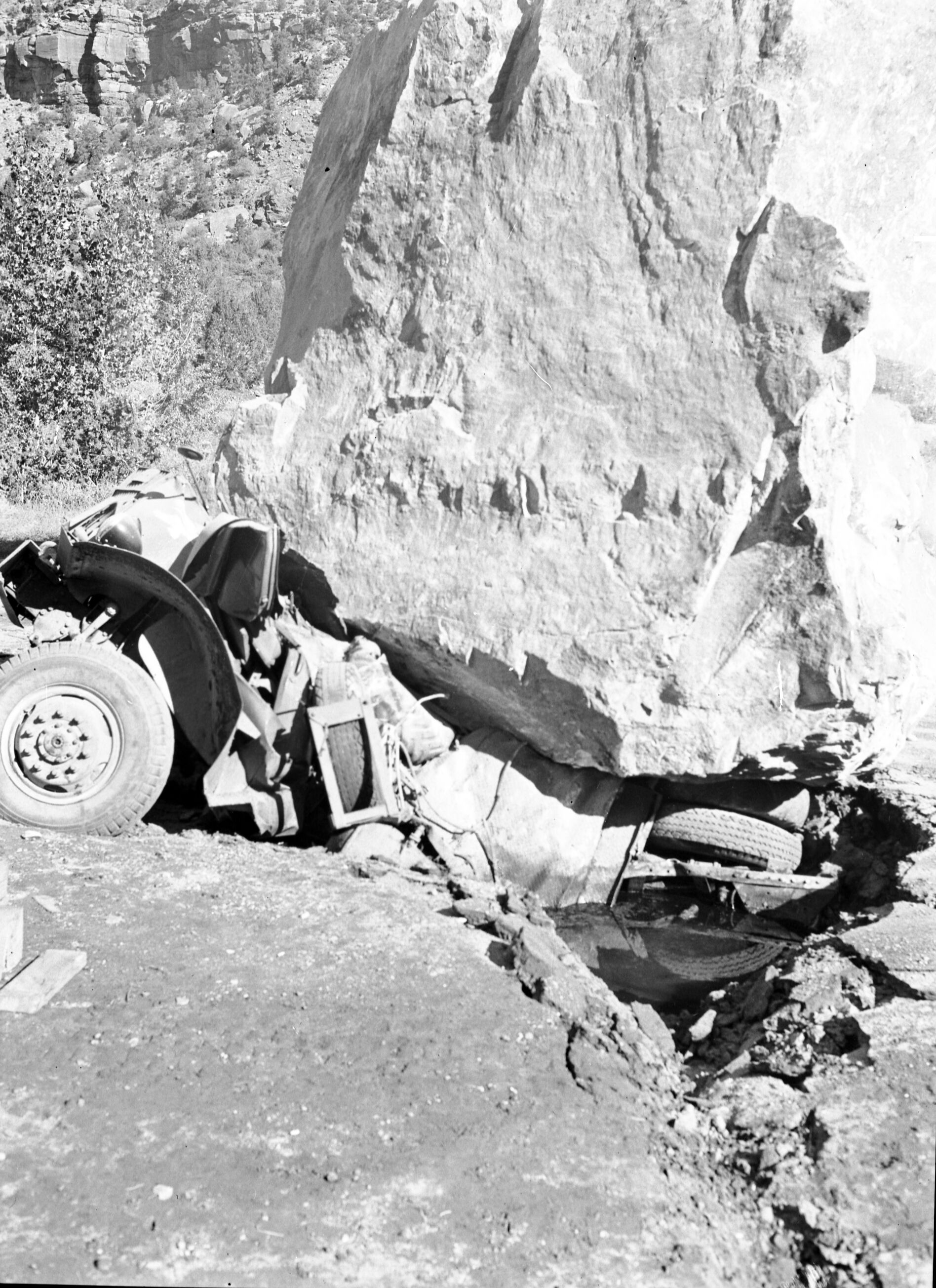880-ton boulder on top of car. ; ZION Museum and Archives Image Zion 7176 107.06 Neg 0072 ; ZION 9021