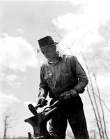Blacksmith working against the clouds. Blue Ridge Parkway. (Mountain Heritage interpretation).