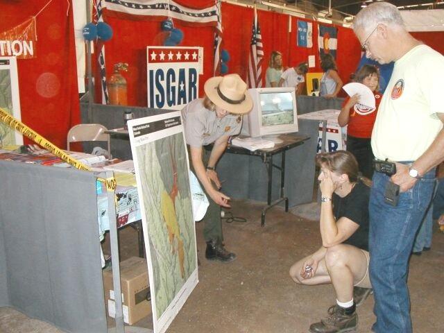 Park ranger, Becky Wiles, discusses Long Mesa fire with two fair patrons
