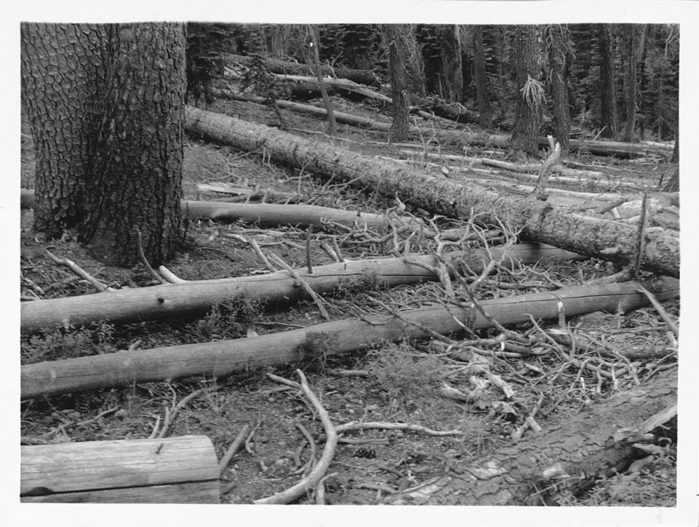 Administrative Collections: Album 5 (Emergency Conservation Works) -Before, during, and after views of roadside and Summit Lake campground cleanup work showing workers and horse teams clearing brush and logs, burning piles of timber and brush from clean up, stacked firewood salvaged from clean up, and areas after clean up