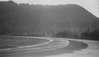 Black and white photograph of a beach landscape in O’ahu. The foreground shows a flat beach with compacted sand and a curved shoreline, starting near the bottom left corner and circling back to the left center edge. Along the middle of the image, a tall tree line extends to the right side, creating a border to the beach. In the background, a large, undulating piece of land rises high into the sky, taking up almost the entirety of the photograph.