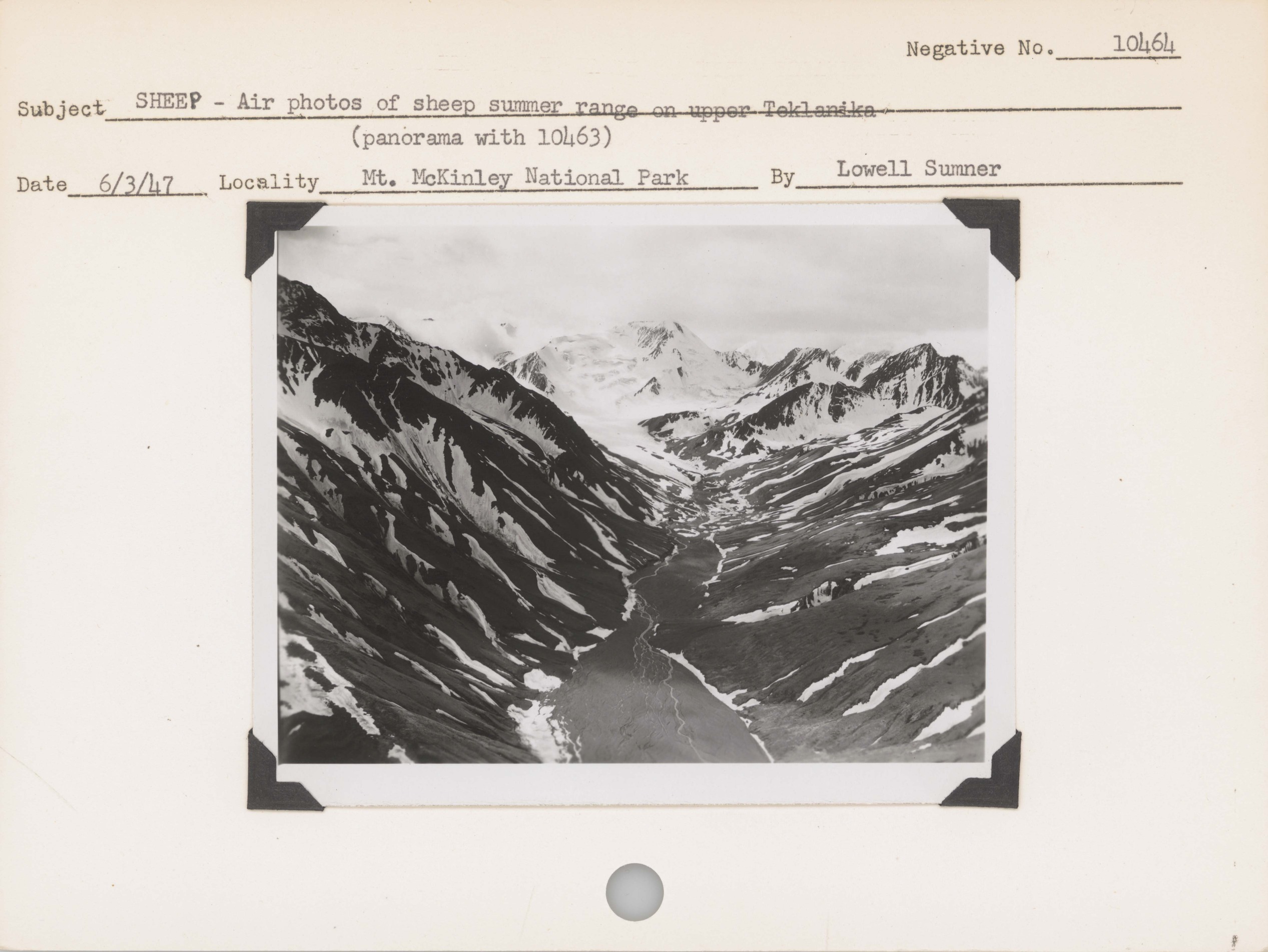 Sheep--Air photos of sheep summer range on upper Teklanika. Locality: Mount McKinley National Park [Denali National Park & Preserve]. Negative #: 10464. (panorama with negative #10463)