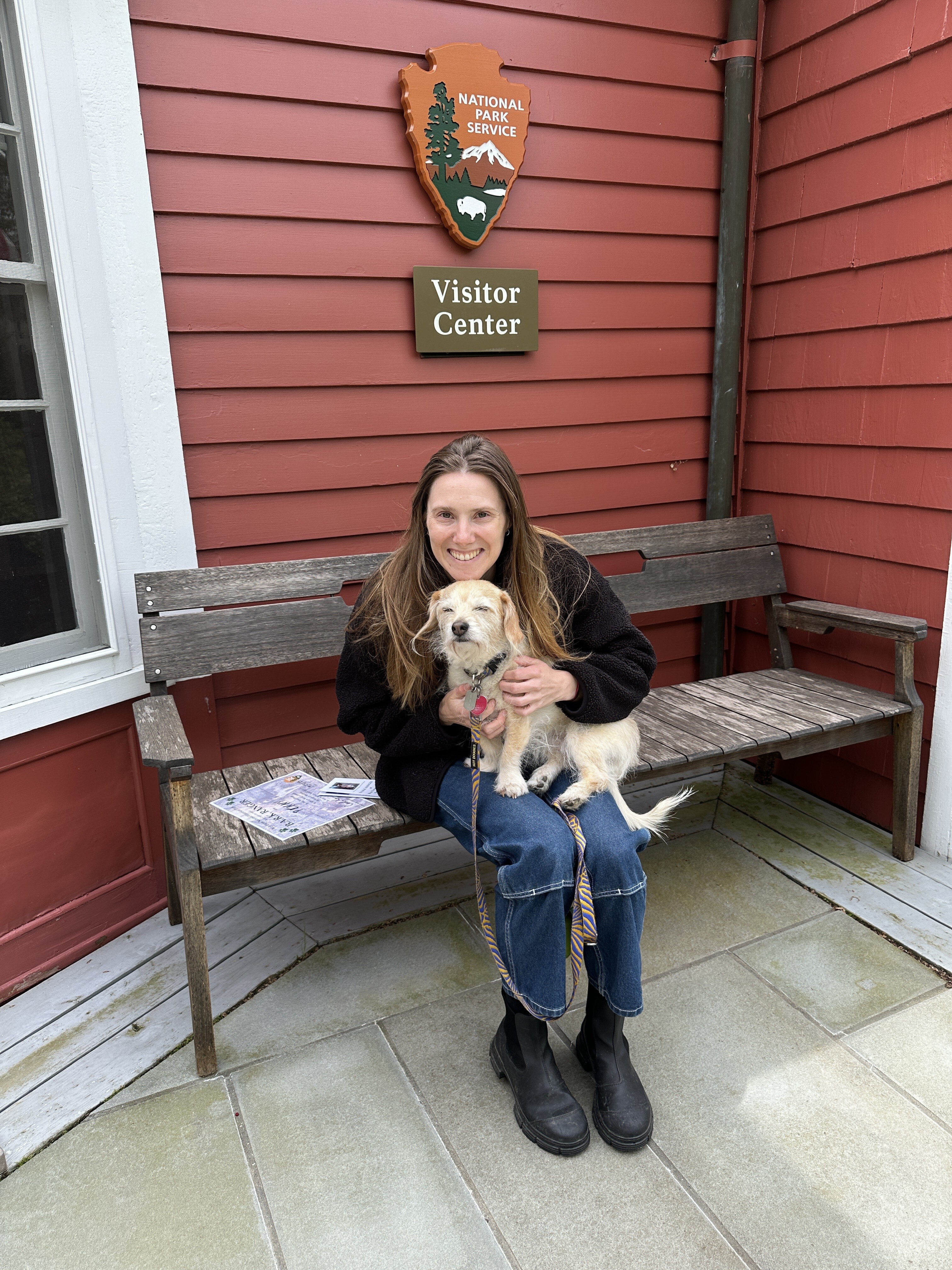 A person sits on a bench in front of a red building holding a dog on her lap.