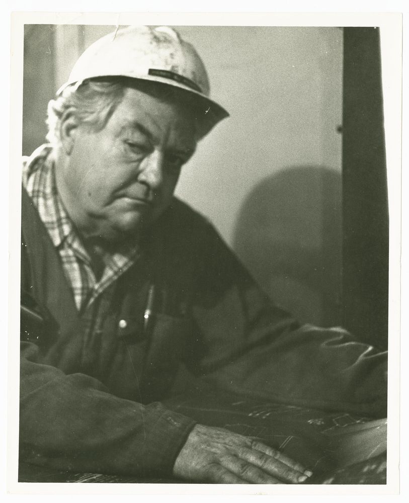 Beviacqua is wearing a hard hat and appears to have marine or naval plans in front of him. Beviacqua was a shipwright foreman at the former San Francisco Maritime State Historical Park.