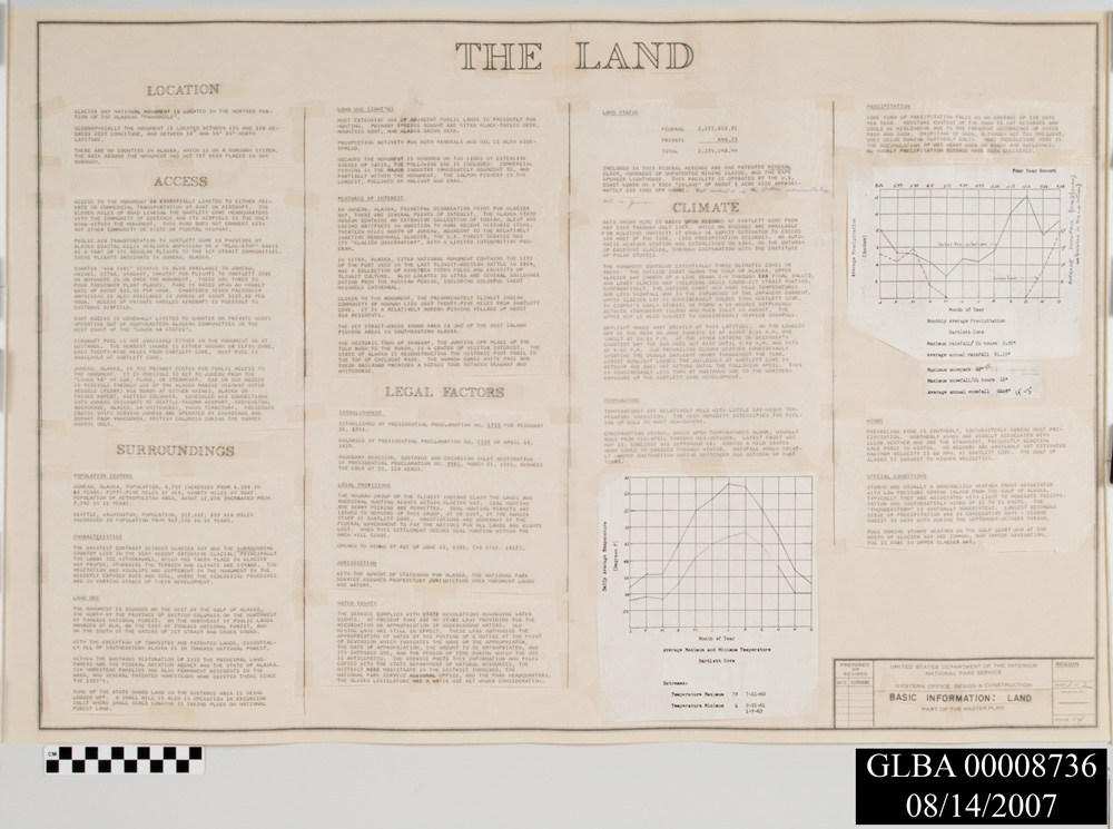 Master Plan for Preservation and Use of Glacier Bay National Monument. 18 pages including maps and text with blue and red ink corrections.