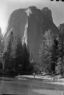Copied by DC in 1935. Original taken by George Fiske. Clouds over Cathedral Rock. An interesting story is that Mr. Fiske was thrilled upon developing this negative to find the familiar face of a San Francisco friend outlined on the cloud in the center. "Wh