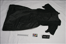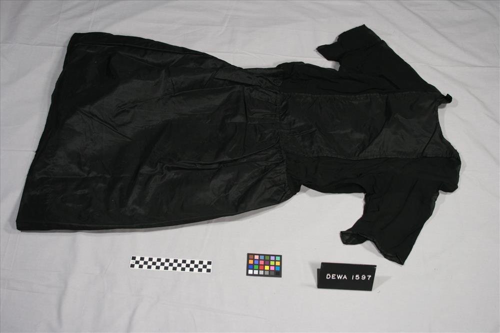 Black dress with a round neck, side inserts that form sleeves, shirred waist and side snap closing