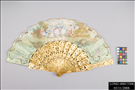 14 GOLD PAINTED INTRICATELY CARVED WOODEN RIBS. PAPER OF UPPER SECTION DECORATED W/ PASTEL WATERCOLORS AND GOLD PAINT. LANDSCAPE ON ONE SIDE, PASTORAL SCENE W/ PLAYFUL FIGURES ON OPPOSITE. RIBS CONNECTED W/ PIN AND 2 MOTHER-OF-PEARL DISCS.<CRSEE LONG 13507 (box).