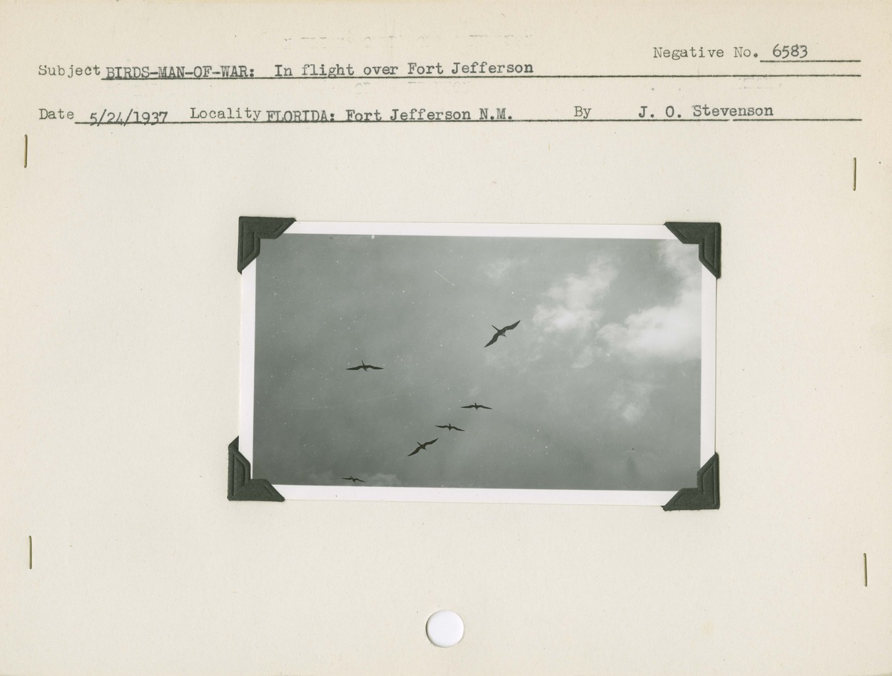 Birds- Man-of-War: In flight over Fort Jefferson. Locality: Florida: Fort Jefferson National Monument [Dry Tortugas]. Negative #: 6583
