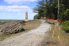 A gravel path leading to a monument with plywood around its base against a blue daytime sky.