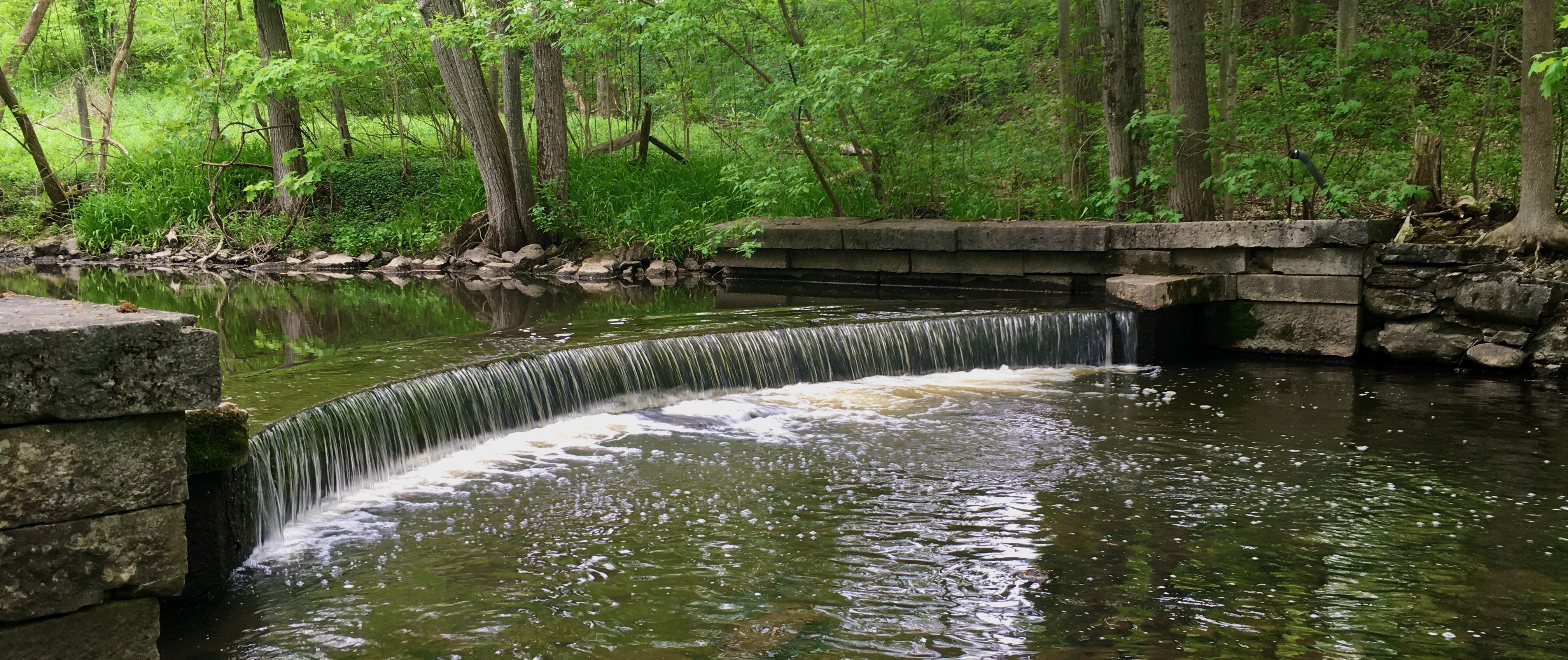 Against the bright green forest background is a large calm river with a manmade semicircular dam that creates a small waterfall along the shape. The water is calm before and after and there are no visible rocks or strainers in the water.
